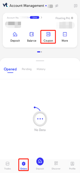 We will organize various official events on the VT Markets App, during which "coupons" will be distributed for your use. To view all available coupons, click on "coupons" on the "Orders" page