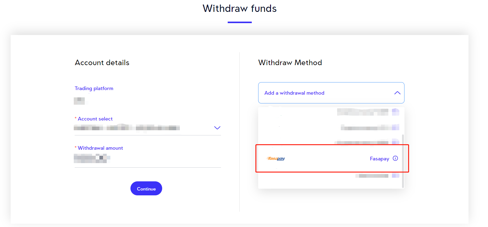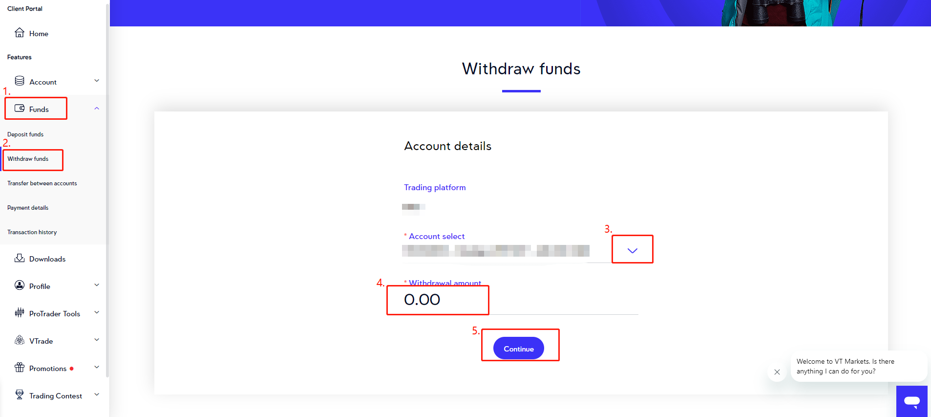 2. Please select your trading account number and fill in the withdrawal amount and press continues.