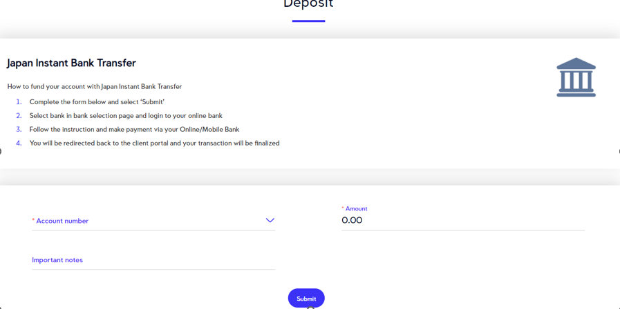 To deposit via this channel, please log in to the Client Portal and follow the steps below.